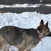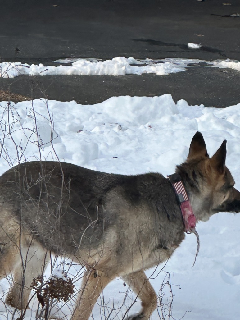 There are 2 German Shepards running around/on Lewis Lake. One has a pink collar and one a purple collar. They are very nice collars, so these dogs belong to someone.