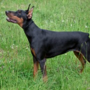 Large, skinny black Doberman, male, docked tail. Seemed young, anxious and pacing, would not approach long enough to get a picture or for me to get him in the car. Google image provided