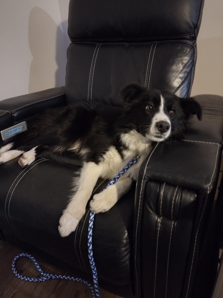 Black and White border Collie female. Found in open field, not near any housing. Appears young. Had collar, no tags.