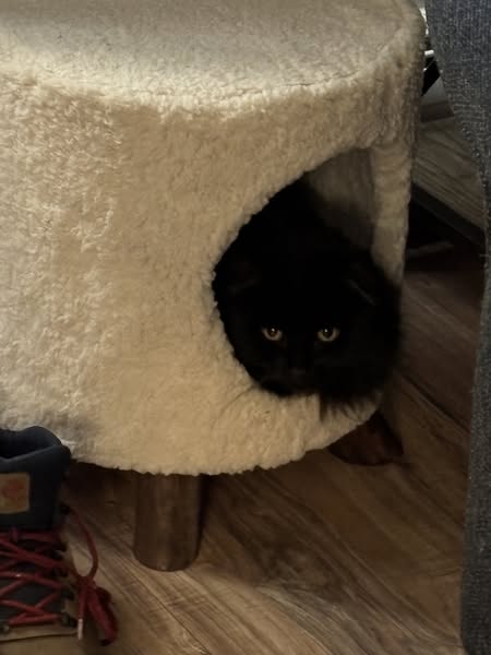 Carbon is an eight year old, long black haired cat. He has a small white patch on his chest, but it is hard to see and often covered by his hair. He is male, neutered and chipped. If the chip is spotted, a call will lead to me. He may have snuck out of my car when I stopped at a rest stop or gas station in Indiana on I-70, while travelling to Ohio from Missouri. He can be very shy, but will come for food, pets or a warm place to be, if not startled.