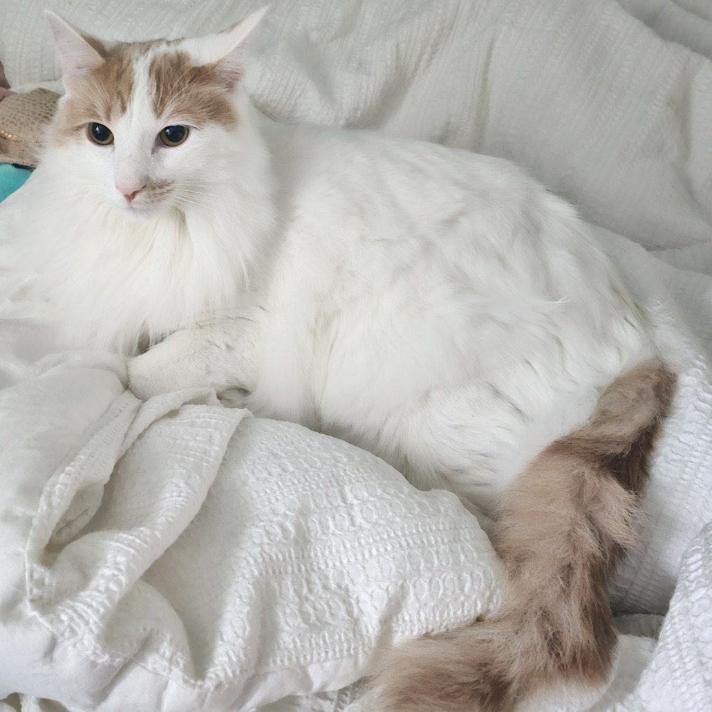 Whiskers is a large, fluffy, long-haired white and tan cat. He looks similar to a Maine Coon or a Turkish Van and is very friendly and not declawed. He was wearing a green break-away collar with a bell and tags.