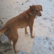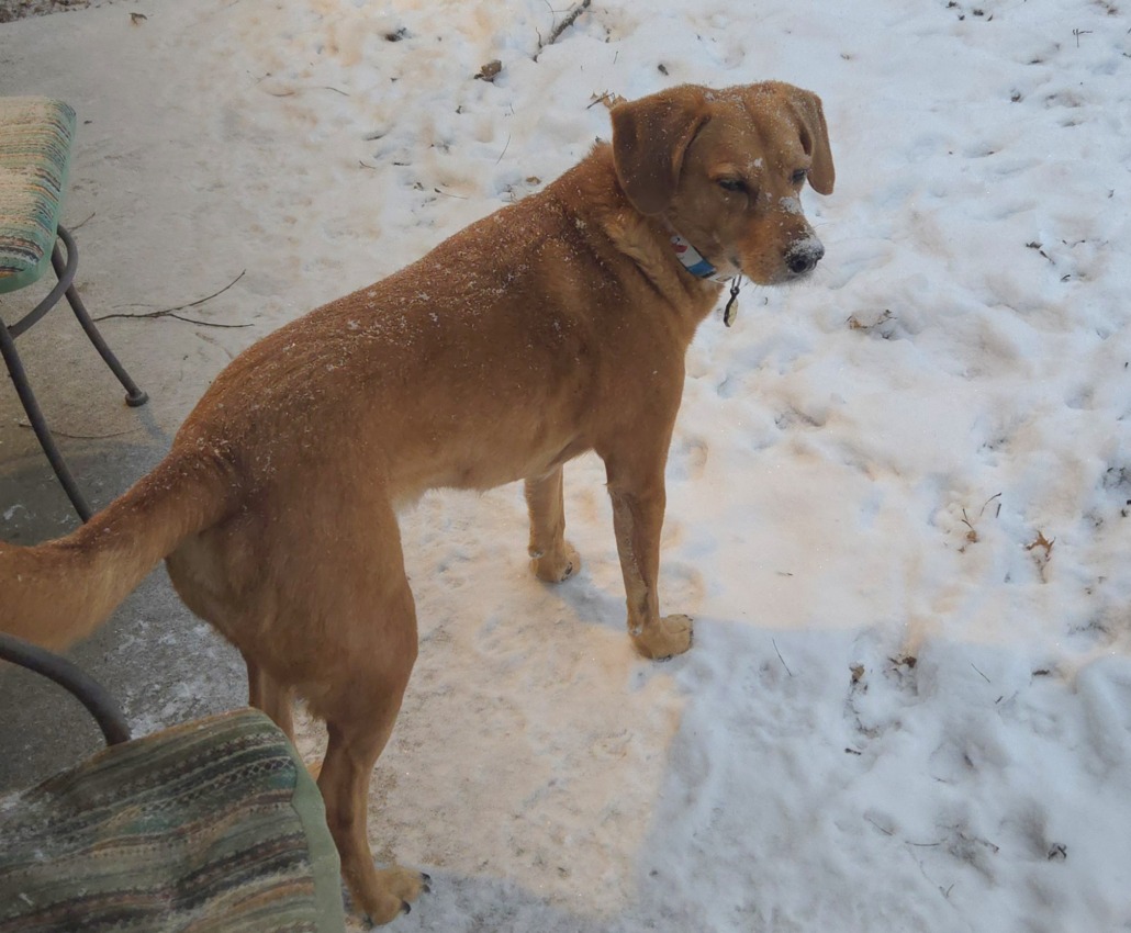 Oliver is a red Beagle Mix with a Lion King collar and bytetag
