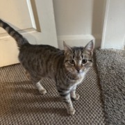 Medium sized, Slightly tan coat with black stripes on his legs, he also has black stripes on his sides along with big black dots, he’s very sweet