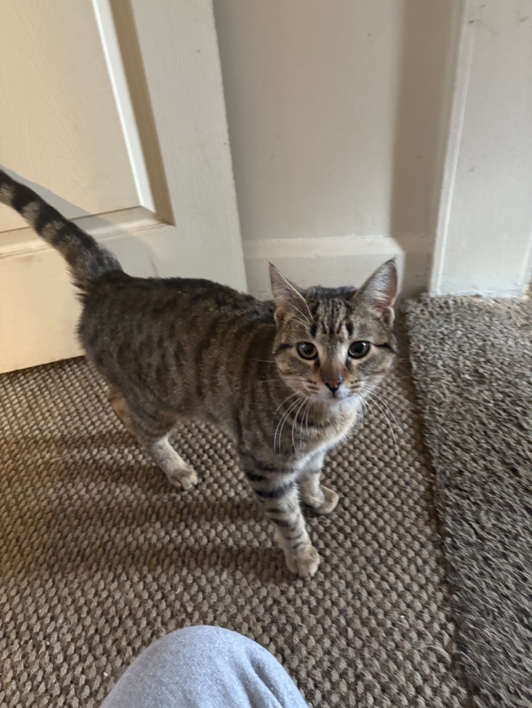 Medium sized, Slightly tan coat with black stripes on his legs, he also has black stripes on his sides along with big black dots, he’s very sweet