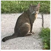 Sweet shy big tabby beige/grey with black stripes. I’ve been feeding him for months. He was not as big when I first found him. He has become very tame and calm and playful. Sleeps a lot. Revolution cleared his earmites