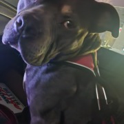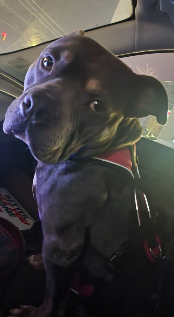 MALE pit mix. Very well kept. Nails trimmed and didn’t seem like he was out for very long. He has some dark spots on him. Found with a bright pink reflective harness.