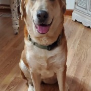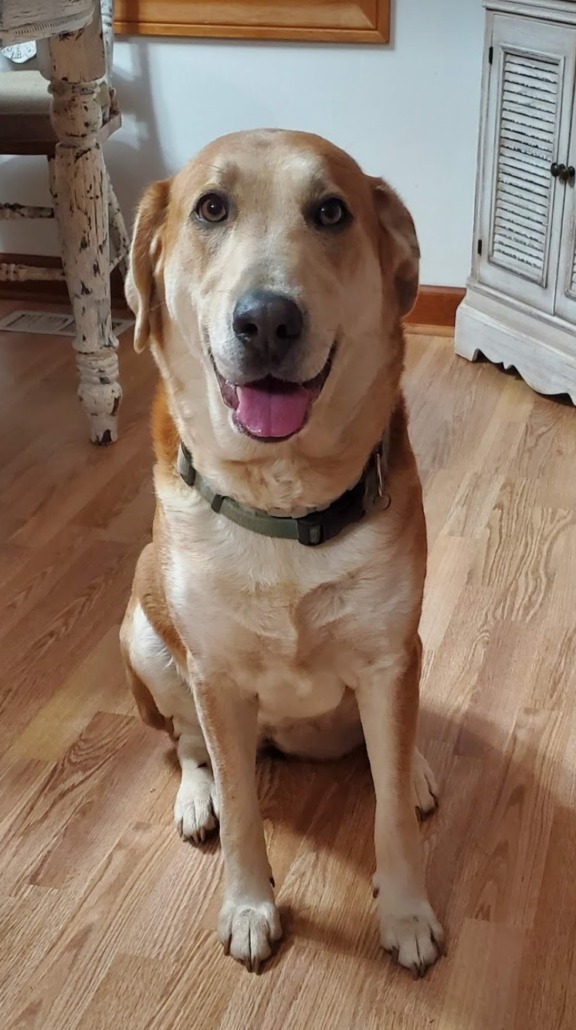 Macie is an 8 yr old lab/healer mix. She has a yellow brown color in her eyes. Wearing a turquoise collar. White chest