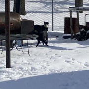 Two dogs running around the business next door with collars on, keep trying to cross the road into the neighborhood across the street on English Ave but almost getting hit