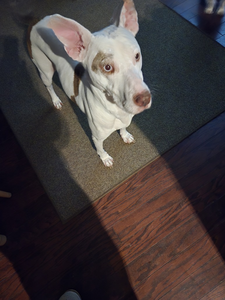 Medium to large white dog with brown patches and blue eyes. Very sweet and well behaved.