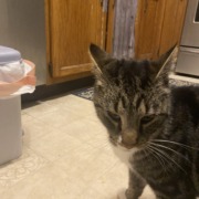 He’s friendly and meows a lot, he has white fur on his feet so it looks like white socks