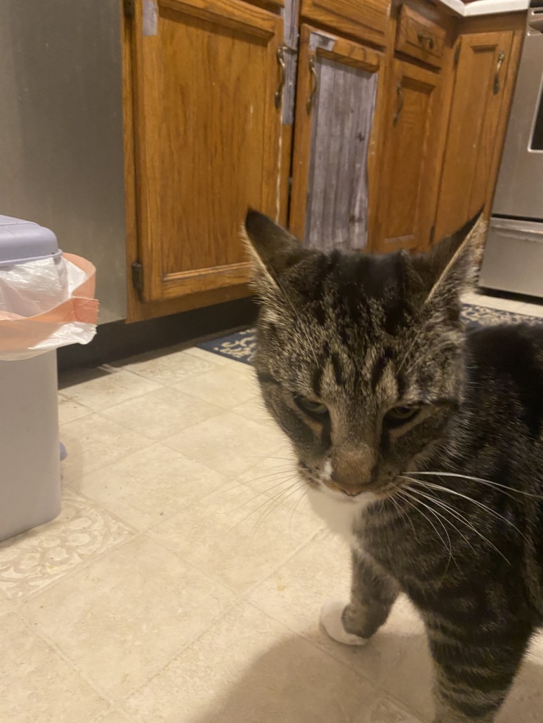 He’s friendly and meows a lot, he has white fur on his feet so it looks like white socks
