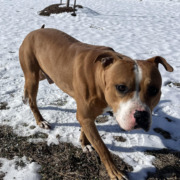 Unfixed male pitbull mix, brown with white nose and feet.