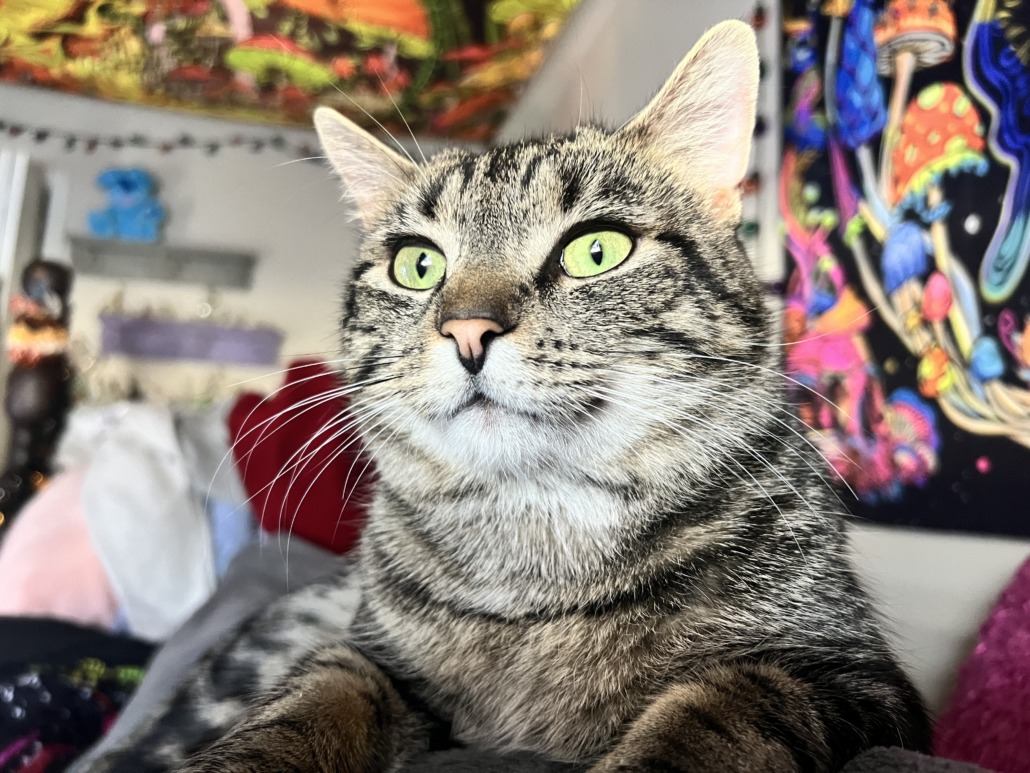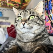 He has stripes that are brown and black, he is bigger ish and he responds to his name well, we are in Franklin. IN