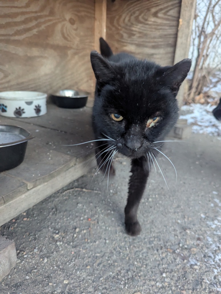 Found older, black cat at community cat colony feeding station. Very hungry. No chip, appears to be a neutered male. Very friendly. Proof of ownership is required.