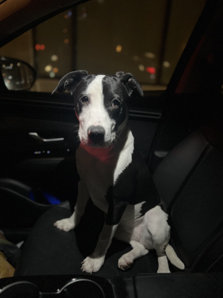 Very sweet. Smells like she just recently had a bath. Hopped right in my car when I stopped for her. Knows some basic commands like “sit”. No collar. Black and white mix breed with a white tip tail.