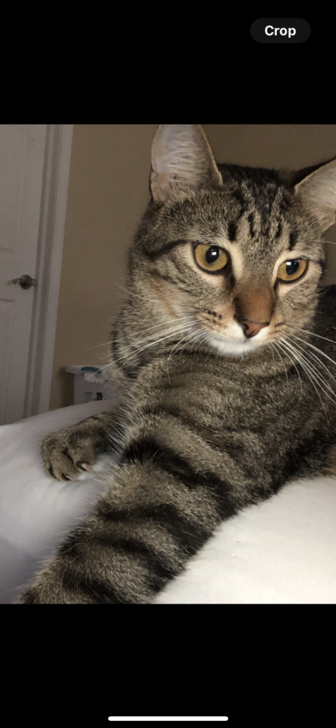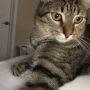 Fairly large, male tabby, yellow/golden eyes but can look green. He’s very sweet but really skittish.