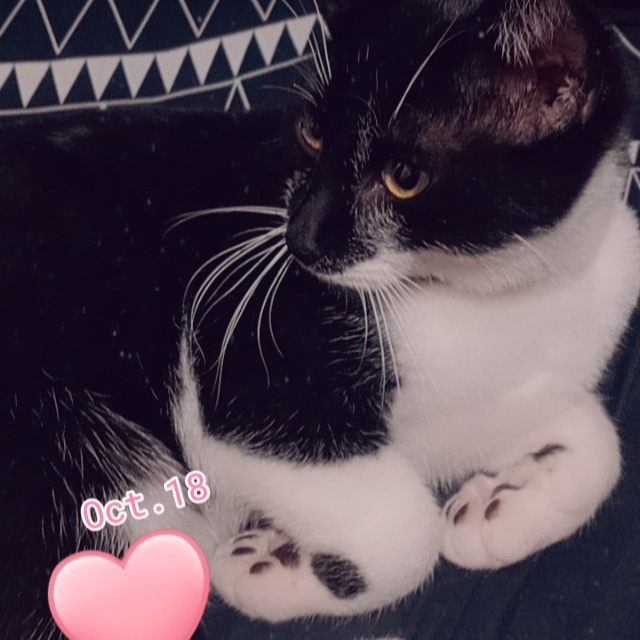 Tuxedo has a purple flea collar…a little spot of pink on his left leg..doesn’t like to picked up loves pets though..