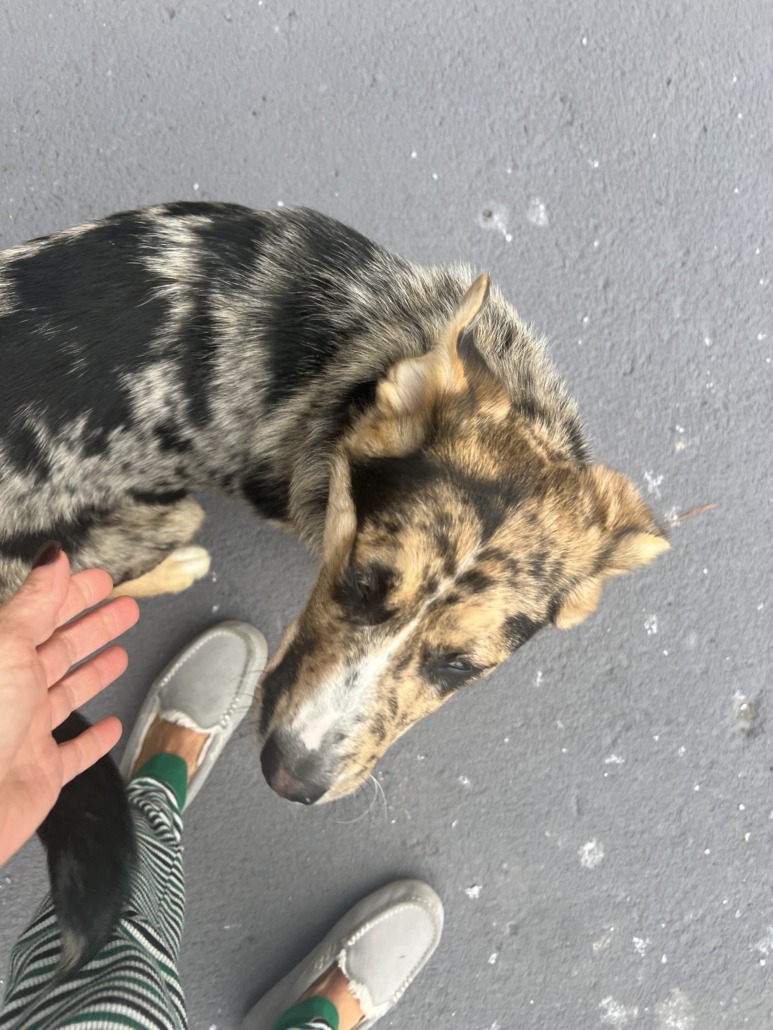 Multicolored dog with one blue eye. Appears to have a shock collar on. Looks young or like a pup. Had a second dog with it, but it ran off from us and we were not able to get it to come back.