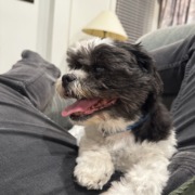Shih Tzu dog, older. Has a tag that says “Max” with my number on it. Very friendly.