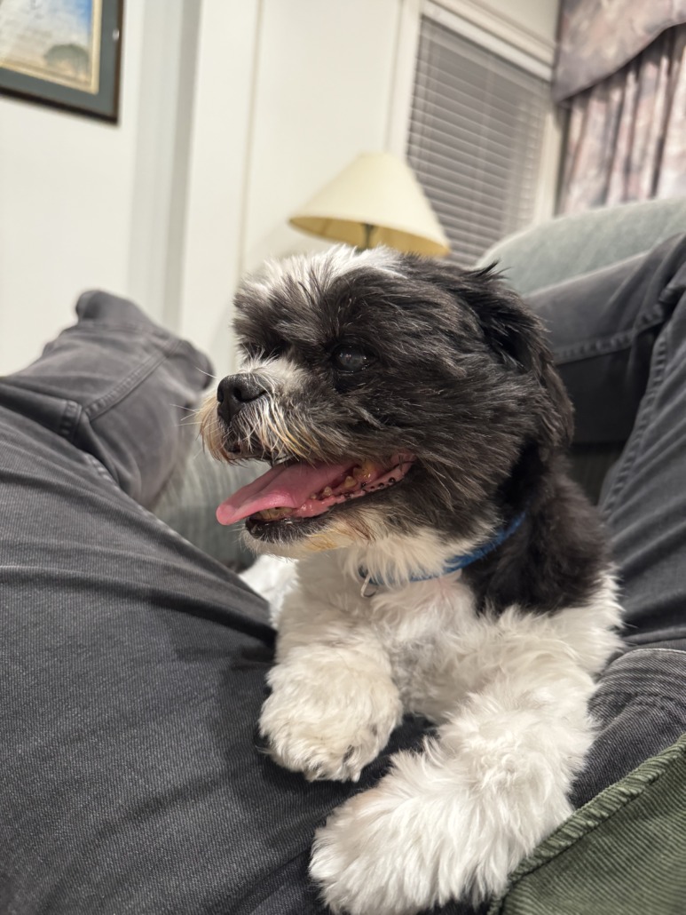 Shih Tzu dog, older. Has a tag that says “Max” with my number on it. Very friendly.