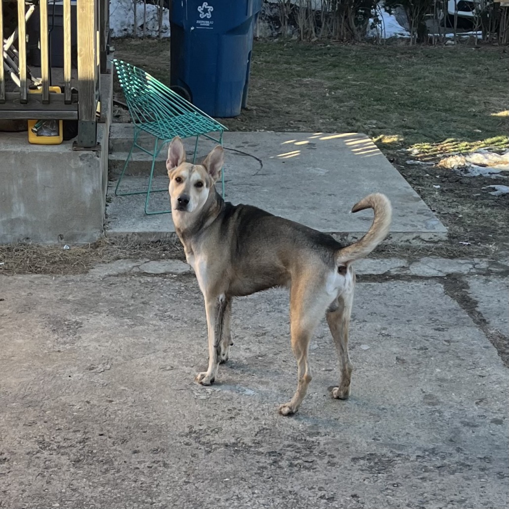 Very tall, healthy appearing dog with ears the stick up. Black on top with a beige-ish undercoat. Unaltered male. Friendly to me & my dog.