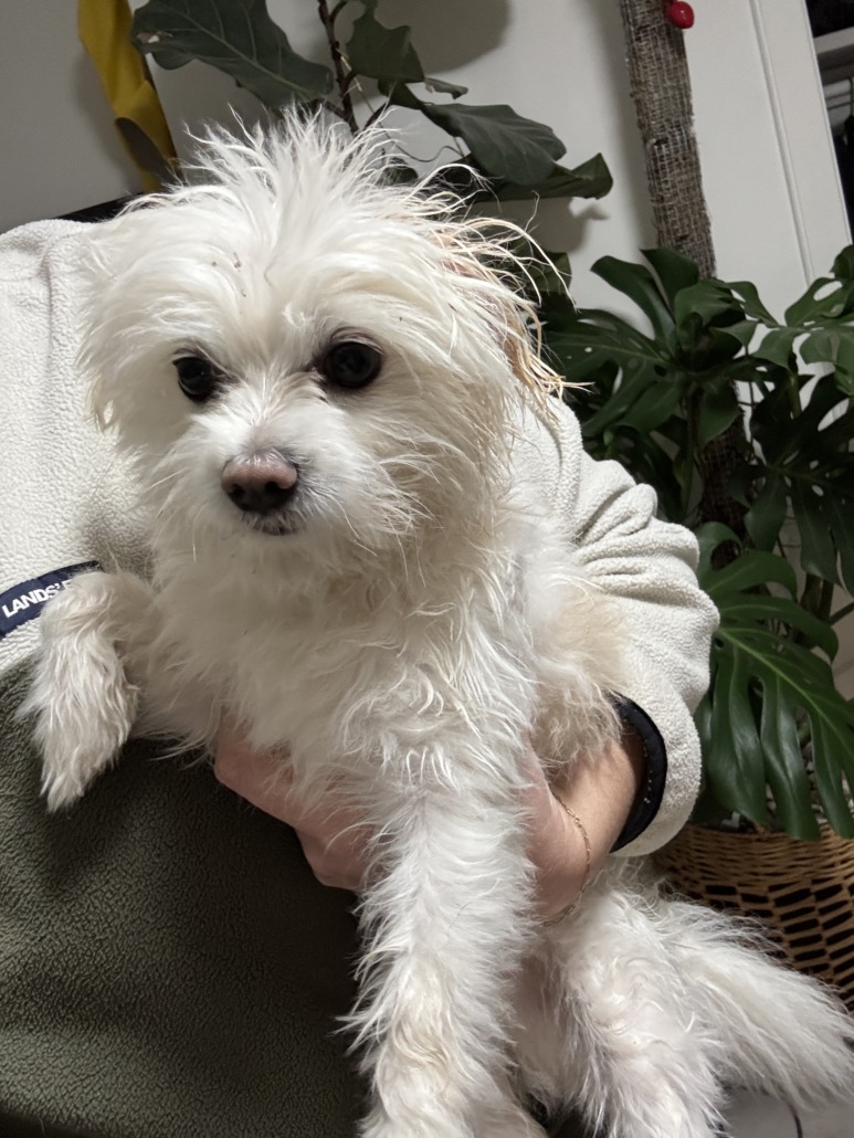 Small white and tan intact male found inside our fence. Seems well cared for and had red collar on – no tags.