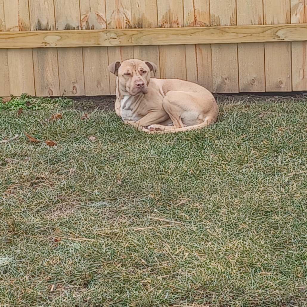 Scared and intact male pitbull. He is non-aggressive and malnourished. He is staying in my unfenced backyard and will not leave.
