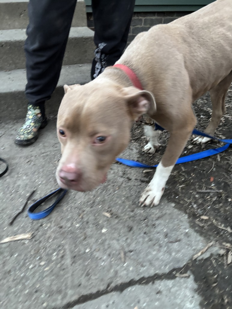 Sweet tan pitbull mix found chained to a fence by paramount school in Brookside Park.