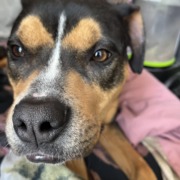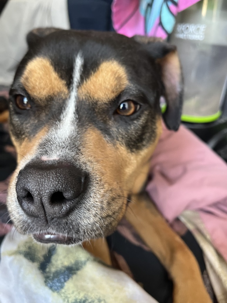 Pit mix but resembles a rott or beagle as well. Has a Smurf collar on. Very sweet and friendly. Has a scar on nose.