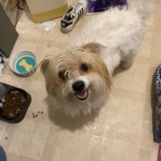 A very handsome brown face with a white mustache with a small brown spot on their left shoulder and a larger brown patch on their right shoulder. Medium long hair on their face. And just an all-around sweet, gentle, adorable, good boy.