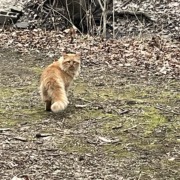 Orange/white long haired cat started coming around on 2/7/25. I think it is a male but can’t get close enough to know for sure.