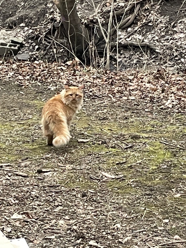 Orange/white long haired cat started coming around on 2/7/25. I think it is a male but can’t get close enough to know for sure.