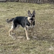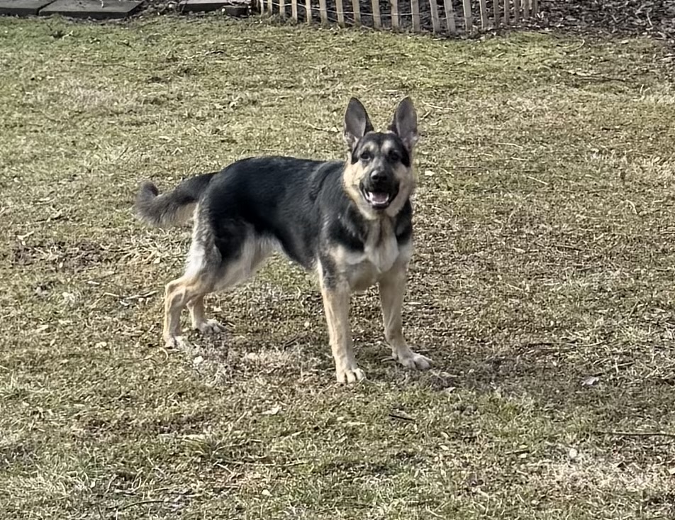 German Shepherd, probably female, wearing a collar with no information on it. Not full grown.