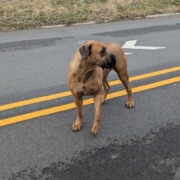 Female, large, beige dog. Might be a type of mastiff. Seems shy and is a little scared, not aggressive.
