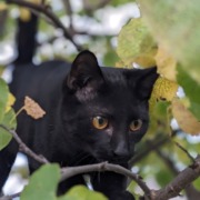 Black fur with white markings on belly, orange/green eyes, very friendly