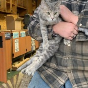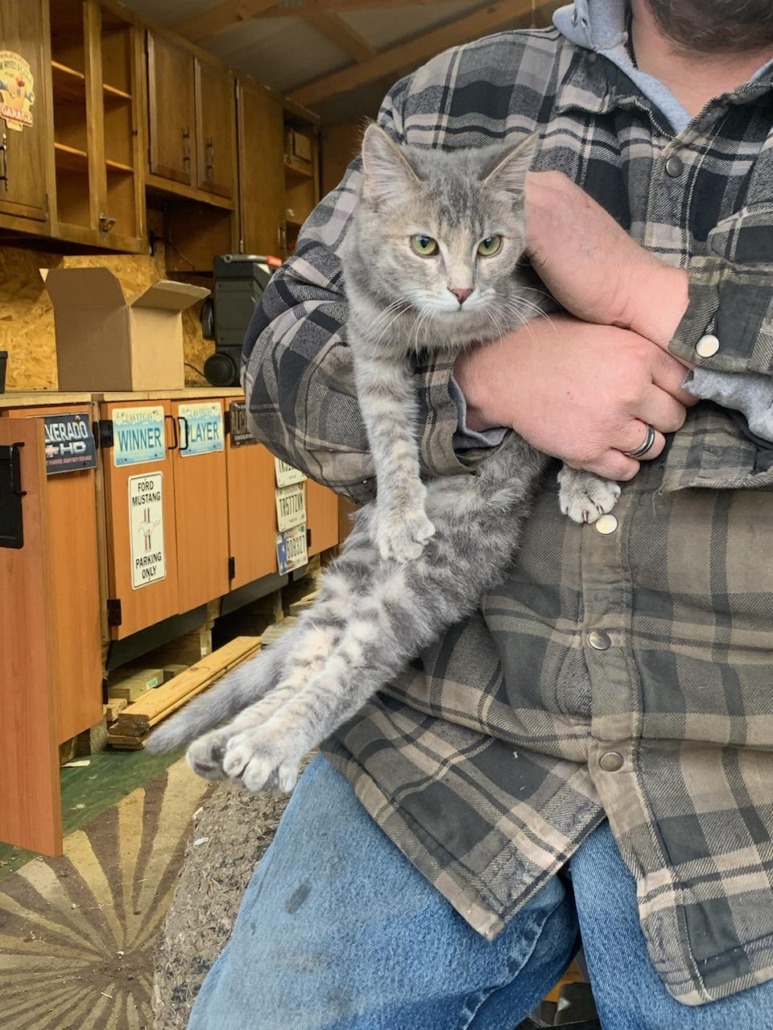 Small, mostly grey with a touch of faint orange in the face. Has hunkered down under neighbors shed