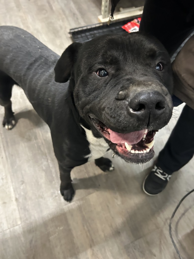 Black dog with white on chest unneutered male. Proof of ownership is required