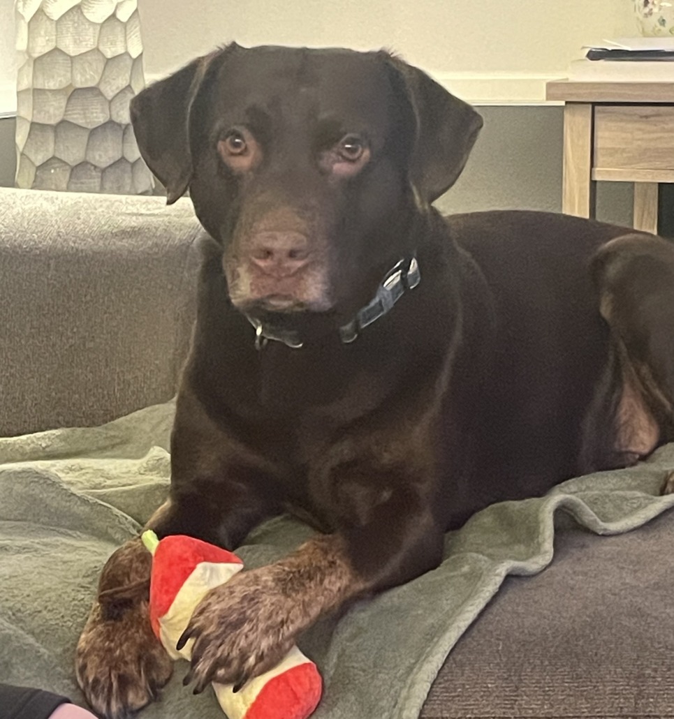 Bishop is a medium/large chocolate lab mix with brindle paws