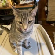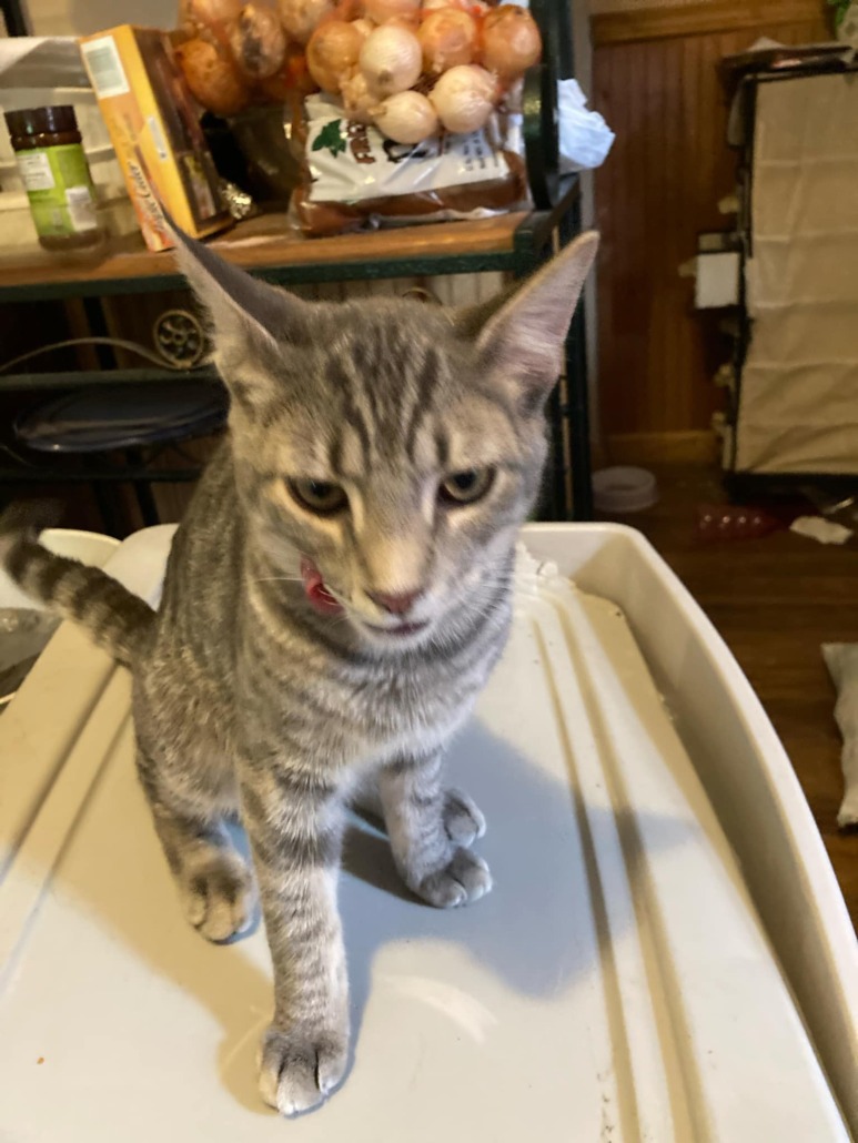 He is grey and has lines on his tail. His left ear is cropped from being neutered. He is sweet.