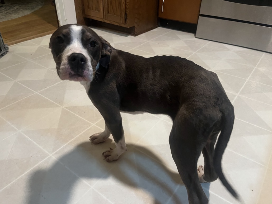 Small female dog. Mostly grey, white front legs, white around neck and on face/nose. Found hunched, tail tucked, soaked, malnourished, dirty, small wounds on both ears, overgrown nails. Very friendly with adults, children, dogs, and cats. Proof of ownership is required.