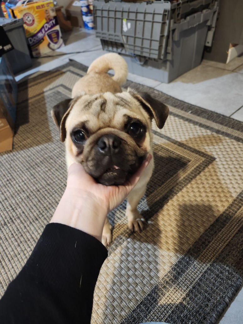 Young tan pug. Sweet with kids. Doesn’t bit or bark.