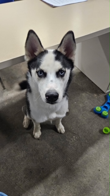 Husky mix, black and white. Blue eyes. Proof of ownership is required.