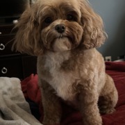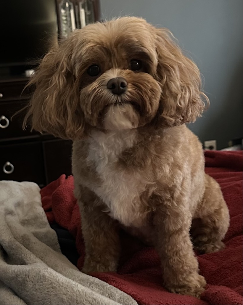 6 year old reddish brown female cavipoo with a white chest. Very friendly.