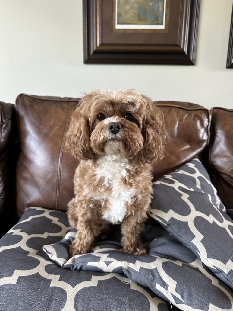 Rosie is a 6 year old Cavapoo. Reddish/Beown with white fur on her belly. Very friendly.