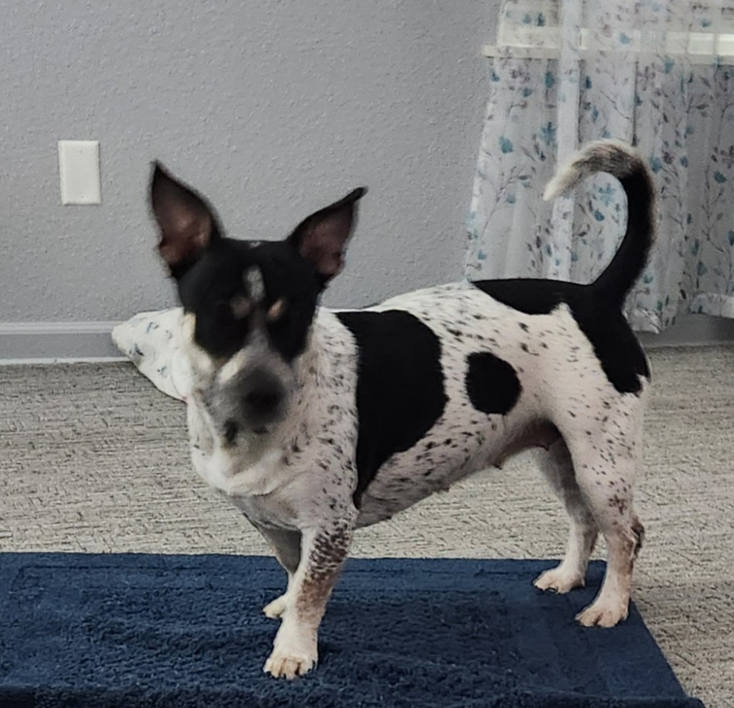 Young female 25 lbs, all white with large black spots. brown and black small spots all over. House-trained. Very sweet. Was wearing a red collar.