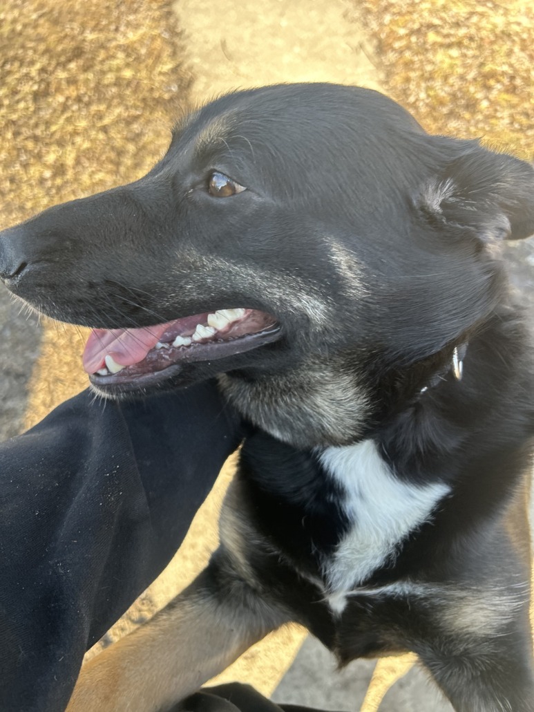 A medium sized dog possibly a female English Shepard with a black collar but no information on it.