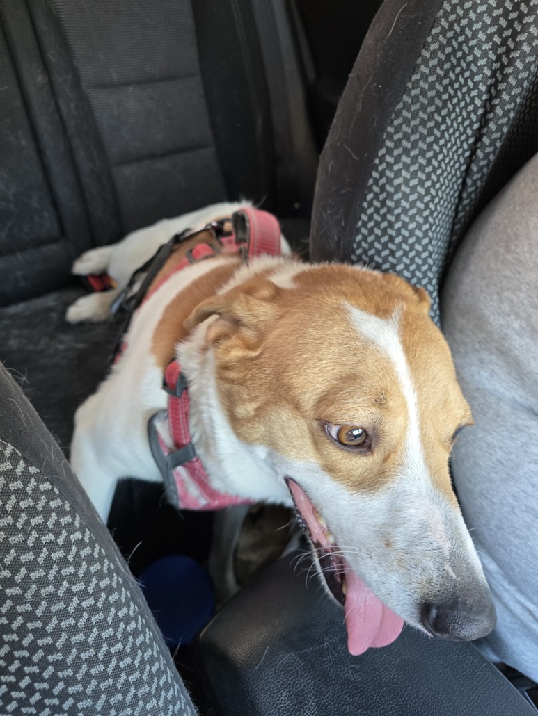 White and brown about medium build not sure about temperament. Barks aggressively at other dogs.
