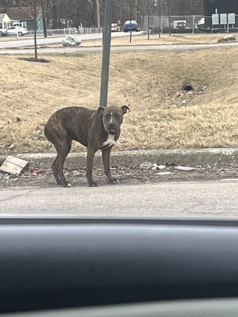 Brindle, I believe male dog. Very scared, ran away and into street if any one tried to get close. Does appear to have a collar.
