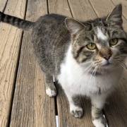 Gray and white male cat. First sighting in early February. He has a pink flea collar on. He’s a big talker and is friendly.