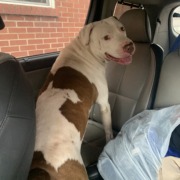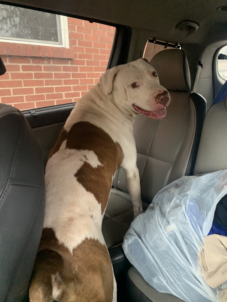 Large male pitbull. White with brown spots. Some slight skin rashes,